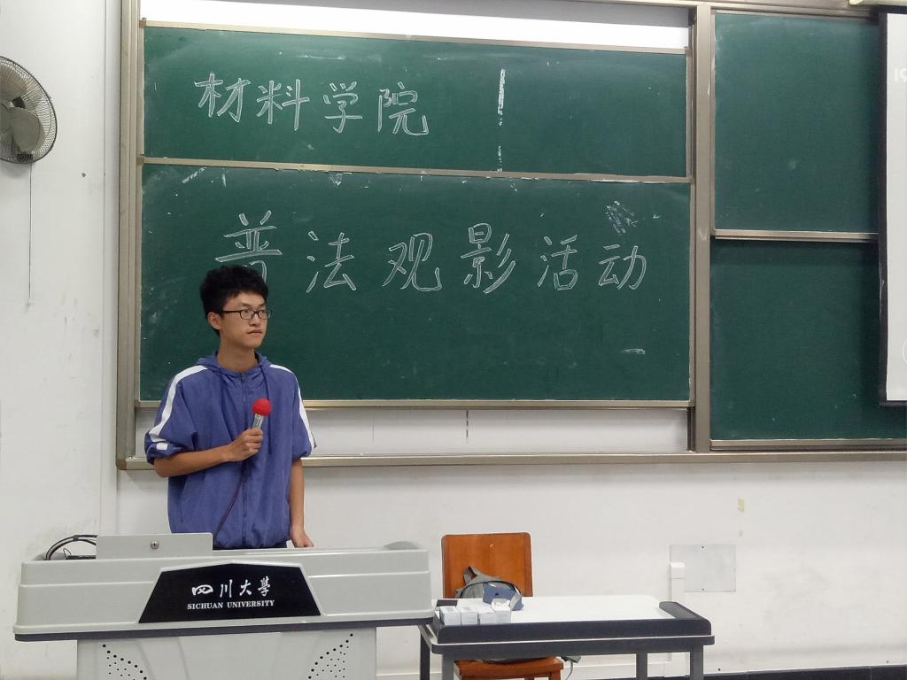 2017年9月17日晚上八点整,由材料科学与工程学院团委学生会主办的普法观影活动在江安校区综合楼C座505教室如期举行。参加本次活动的嘉宾有材料科学与工程学院团委学生会执行主席欧飞洋同学、分团委副书记张爽同学、执行副主席陈珏羽同学。本次活动主要目的是宣传法制意识、提高大学生法制素养,此次观影人员主要为17级的新生。