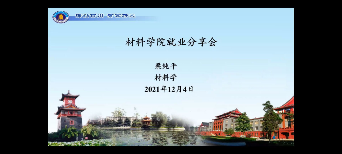 2021年12月4日15:00-16:30,由材料科学与工程学院主办的就业经验分享会通过腾讯会议形式顺利举办。活动邀请到了材料学专业博士研究生梁纯平、硕士研究生梁雪蓉给同学们带来就业经验分享。整场活动由能力提升部的刘星池同学主持。