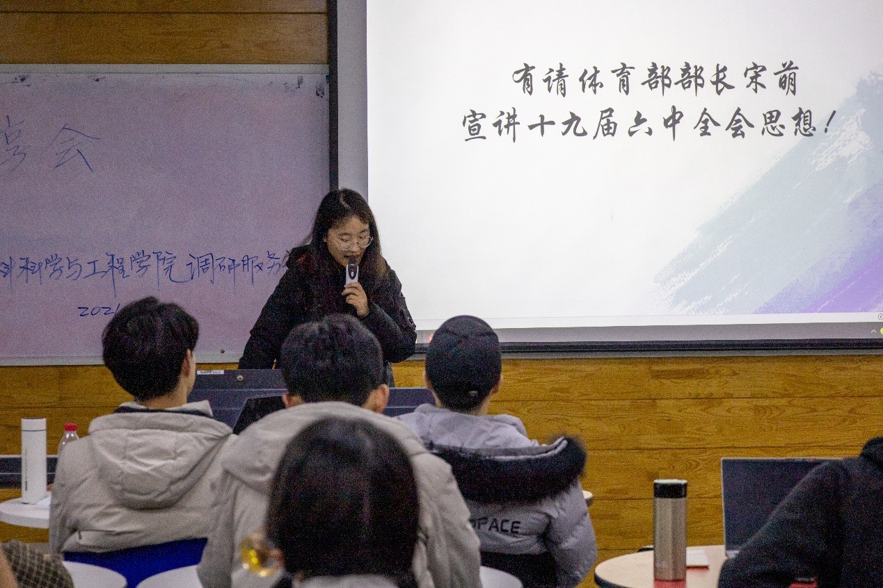 小游戏结束后,由体育部部长宋萌同学宣讲十九届六中全会思想,讲述了《中共中央关于党百年奋斗的重大成就和历史经验的决议》对于全党的重要意义,并且介绍了《决议》的基本框架,最后比照党的十九大报告,并结合习近平总书记“七一”重要讲话精神,加深大家对党的认识。