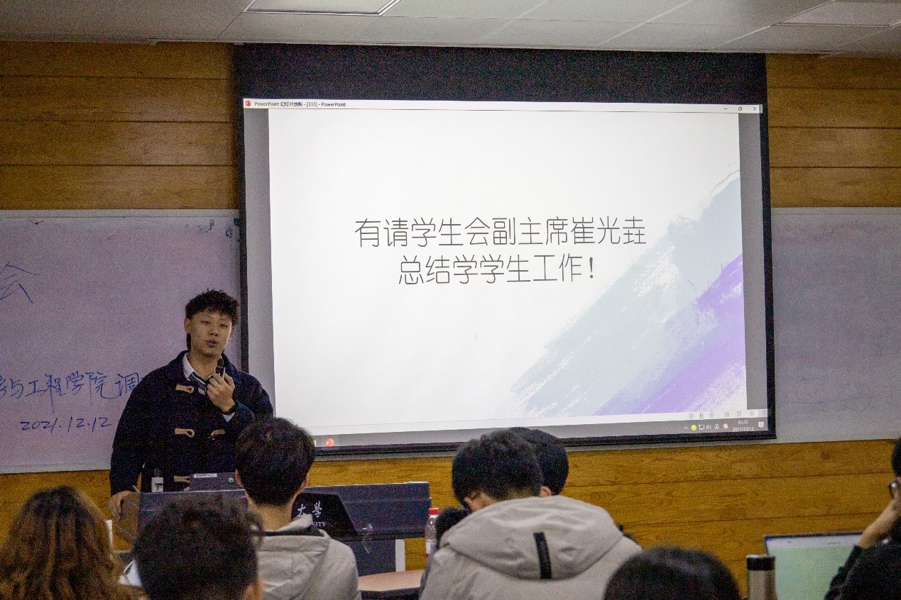 接下来,由学生会副主席崔光垚同学总结本学期的学生工作,对于本学期出现的一些问题进行了总结反思,并提出下一步的工作展望,勉励在座的各位主要干部对于接下来的工作要充满信心。
